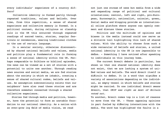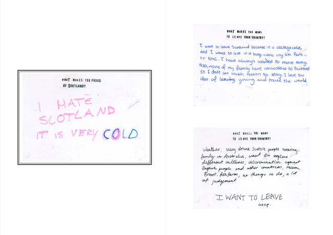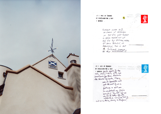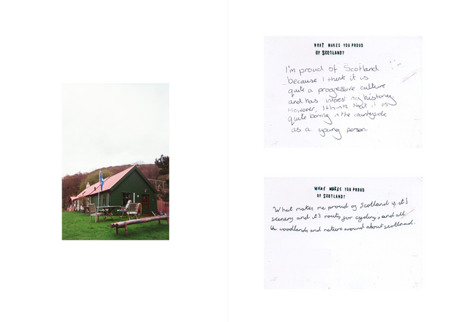 With a tent and two panniers, I set off from my then home in north east Scotland to my childhood home in south west England exploring these questions by bike, photographing every Saltire, st George's cross and Union Jack along the way. I used the journey between these two homes to ask the public about the country they are in, handing blank stamped and addressed postcards to households displaying national flags, to local youth groups and individuals. On arrival in south west England, eighty handwritten responses greeted me.